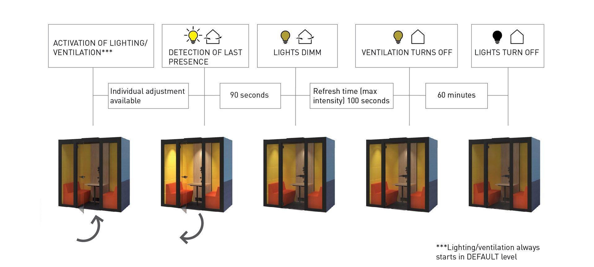 Díky řešení větrání a osvětlení nabízí ACOUSTIC ROOM prostředí zvyšující produktivitu. Čtyři velkokapacitní ventilátory zajišťují správný průtok vzduchu 400 m³ / h s velmi tichým provozním chodem. Kombinace tří LED lamp vytváří příjemnou a domáckou atmosféru. Inteligentní řídicí jednotka volí optimální úroveň ventilace a osvětlení a v případě potřeby umožňuje individuální nastavení. Jakmile zaměstnanec opustí ACOUSTIC ROOM, automaticky se aktivuje intenzivní větrání a připraví místnost pro dalšího uživatele. Tato akustická budka také pomáhá s úsporou energie, protože automaticky tlumí světla, když v místnosti není nikdo, a po nějaké době je dokonce vypne.