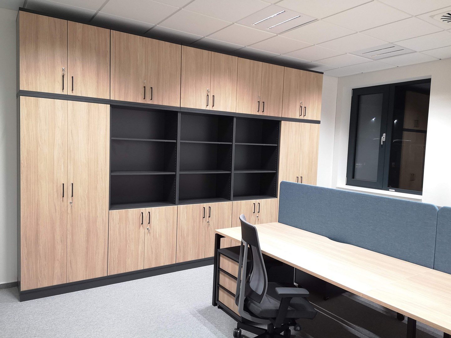 Použitý nábytek: pracovní stoly MOON U / skříně SAVE CH a SAVE U / manažerská nábytek ARA / mix sedacího nábytku / výroba atypických nábytkových dílů