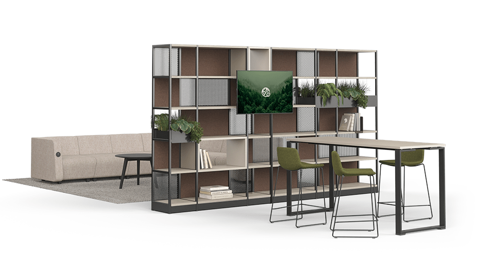 Regálový systém využijete pro pohodlné uložení mnoha věcí. Vyberte si z uzavřených nebo otevřených polic s boxy a zásuvkami. Použijte zarážku na knihy pro uspořádané a uložení knih. Pomocí truhlíků můžete snadno pěstovat rostliny a vytvořit tak biofilní kancelářské prostředí. Začlenění rostlin do kanceláře nejen dodává příjemný nádech – zelené plochy zvednou naši náladu a snižují hladinu stresu, což je zvláště důležité v pracovním prostředí.